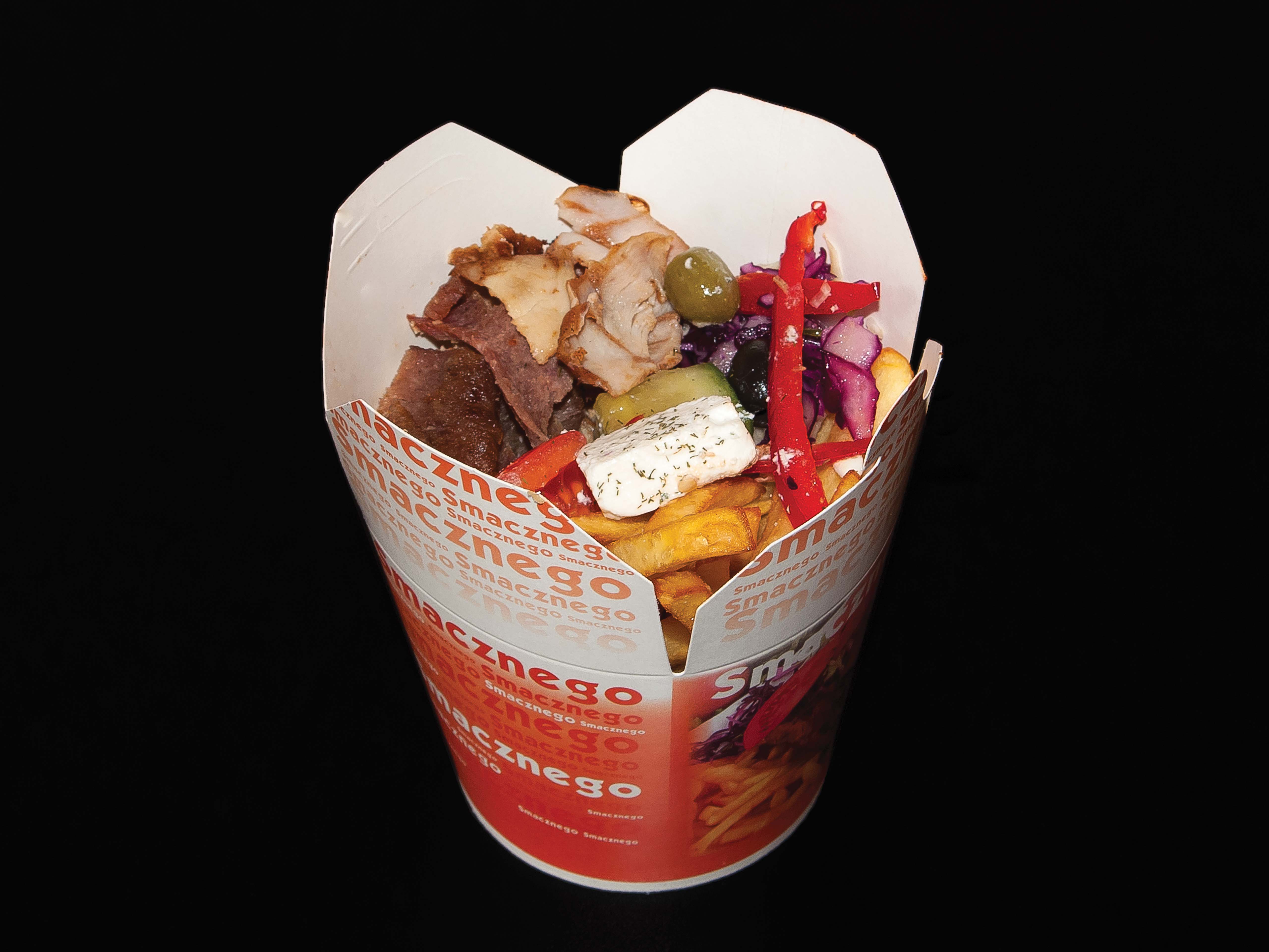 (mięso z kurczaka, wołowina lub mieszane, surówki, frytki, sos)